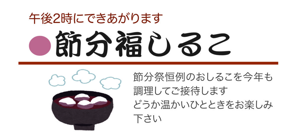 午後2時から恒例の福しるこをご用意します。暖まってください。